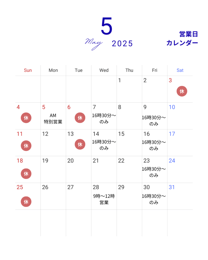 5月の休業日 最新 お知らせ 2025.04.30 変更点ございました! 5.5 AMのみ特別営業🎏 5.28AM9時〜12時営業 毎週金曜日休み → 16時30分〜 夕方1件だけご予約可能です🗓️ 5月もよろしくお願いします🏋️♀️